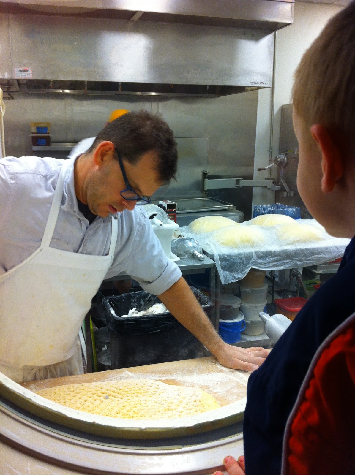 Gus and Daddy checking out the owner of Dutch Monkey Donuts making donuts!